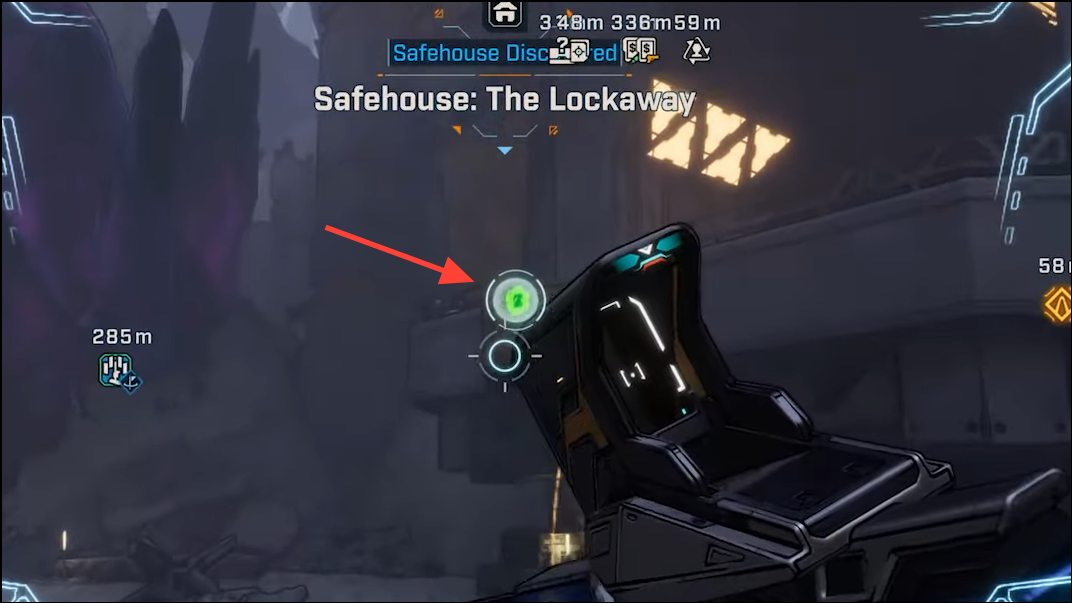 Step 3: Use the grapple points on the higher platforms along the arena’s far side to reach the entrance of The Lockaway safehouse. The door sits above ground level; the grapples are the intended access.