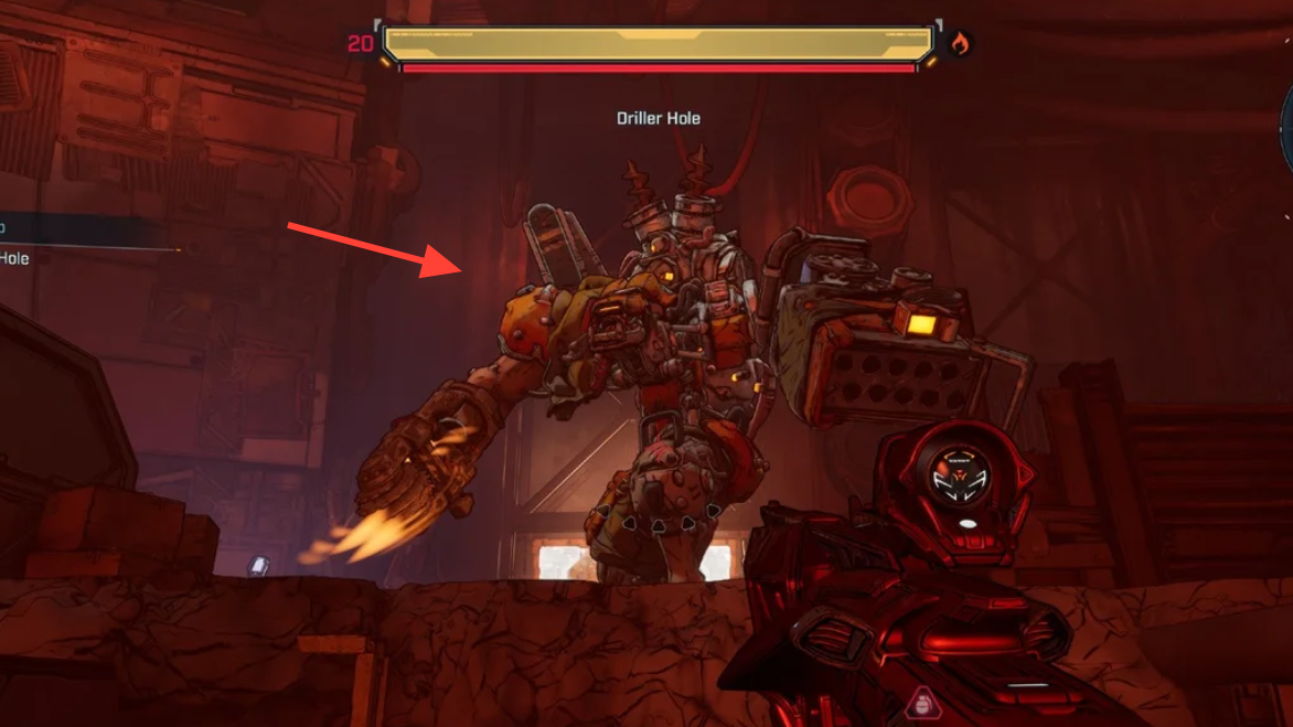 Driller Hole runs a two-phase script with two health bars—Armor, then Flesh. He’s slow but saturates the arena with rockets and ground hazards.