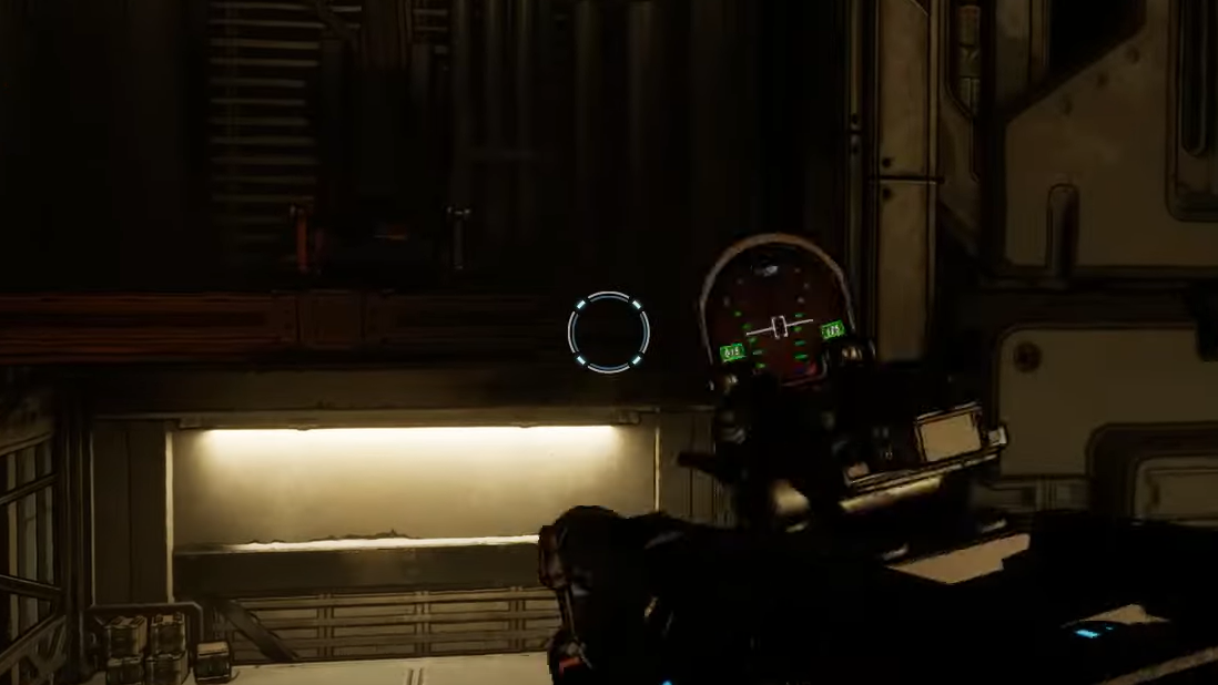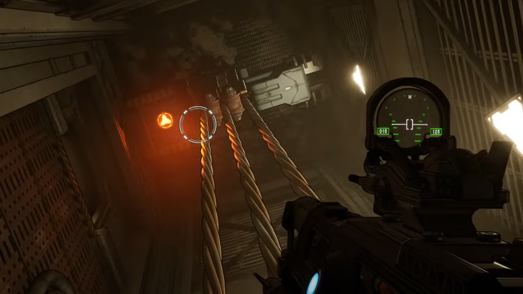 - 5) Unlock and advance. Hit the console button to open the door and continue to a tall, seemingly dead‑end elevator shaft.