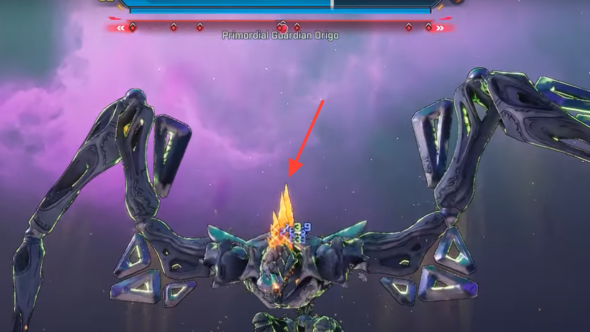 Critical damage: aim at the crystal spikes on top/back of its head. They’re always hittable with line of sight and are the most reliable crits while you’re airborne. Origo often begins with Cryo beam across the arena—open with Shock shots into the spikes as you strafe or glide.