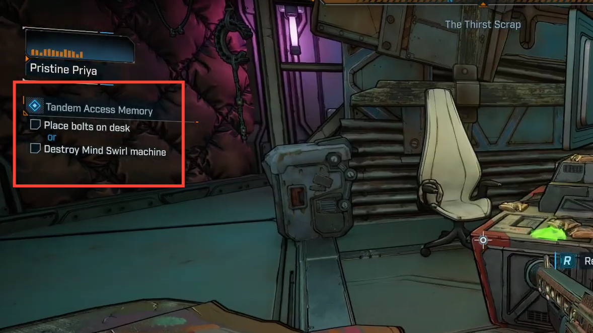 Tandem Access Memory is a short side mission in Terminus Range built around a simple moral choice. You’ll gather “bolts” for Pickett Fenster at The Thirst Scrap, then decide whether to feed them to a Mind Swirl setup or scrap the rig. Both paths wrap the quest cleanly with the same payout.