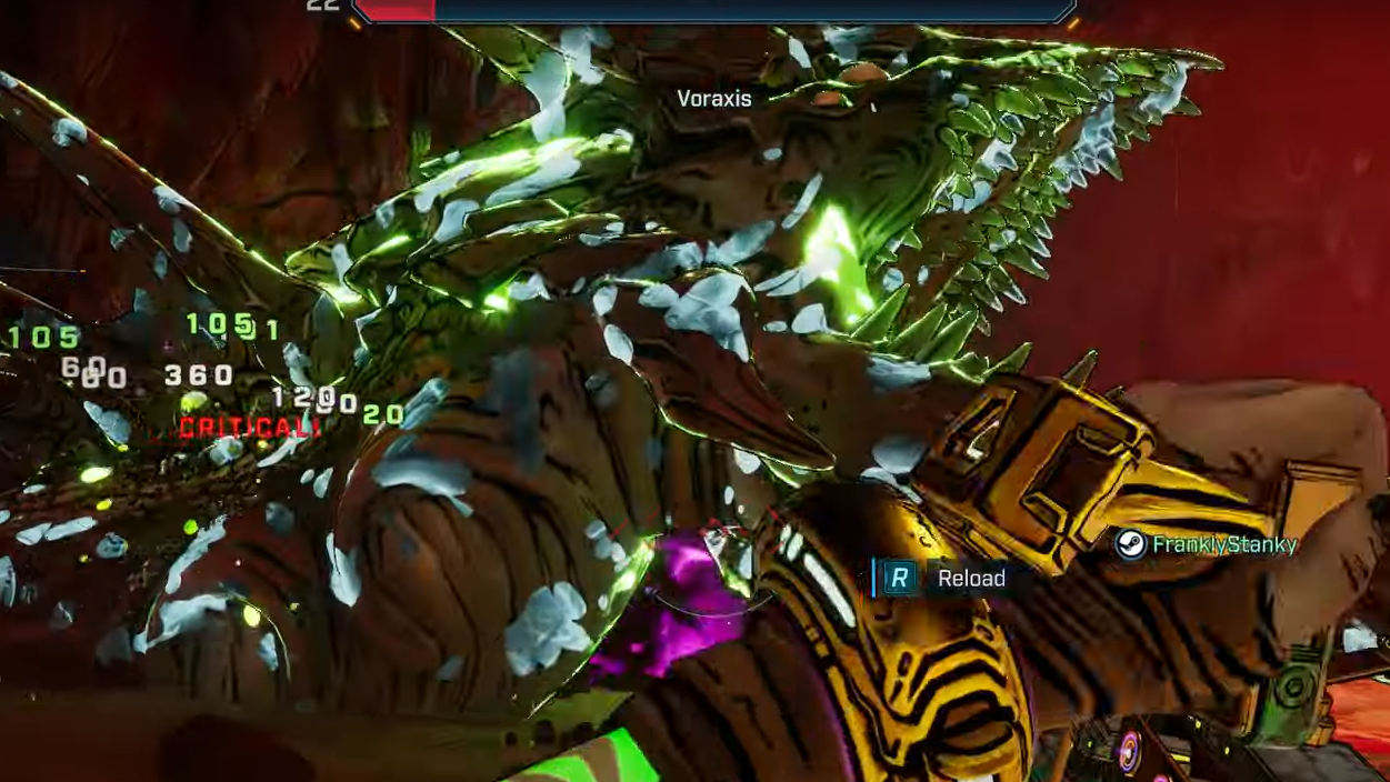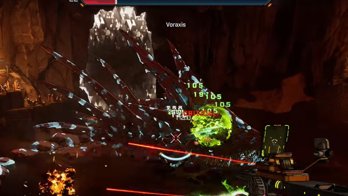 - Aim for the eyes: Voraxis’ eyes are its consistent weak points. Staying on those crit spots will peel through health faster than spraying the carapace.