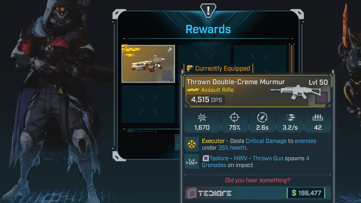 - Murmur (Legendary Tediore Assault Rifle): executes weakened enemies with guaranteed critical hits on targets under 35% health.