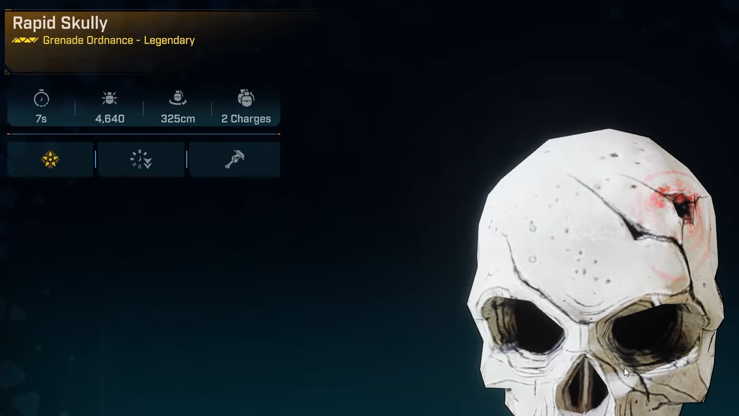 - Skully (Legendary Order Grenade): a homing grenade that seeks the nearest target and fires projectiles.