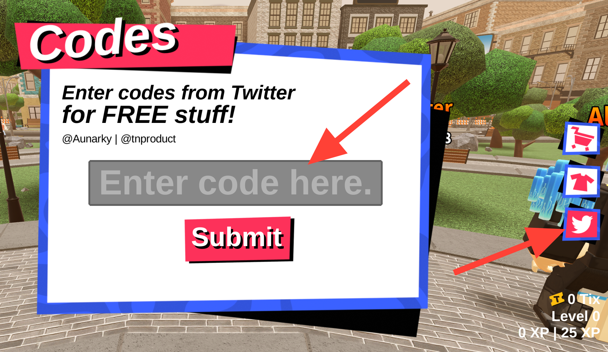 Step 2: Look to the right side of the screen for the Codes/Twitter bird icon and select it to open the code box.