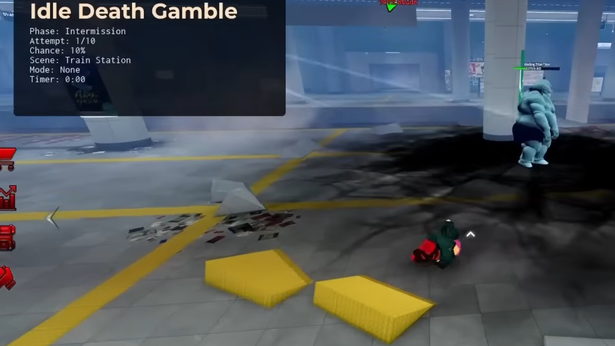 The domain expansion, Idle Death Gamble, is the signature payoff of the entire build. When activated, you and your opponent are pulled into a train station scene. The domain cycles through multiple attempts, each with an escalating chance to "hit the jackpot." On attempt one, the chance starts at 10%. Each subsequent attempt raises the probability — roughly 18%, then 26%, then 33%, and so on — until you're effectively guaranteed to trigger it by attempt ten.