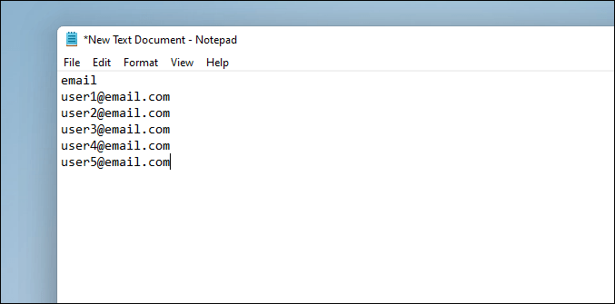 The next thing you need is a “*.csv” file with the email addresses of the users you want to add. It could be an Excel file, or it could be a Notepad file with the “*.csv” extension. If you want to use a notepad file, you’d need to enter the email addresses of the users one address per line. Before entering email addresses, enter ’email’ at the top to make it look like a column.