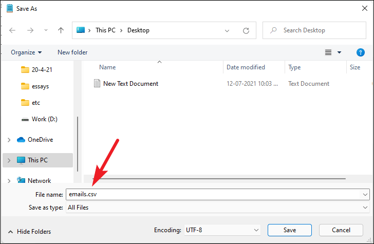 Then, save the file with the .csv extension. Enter .csv as the extension and select ‘All Files’ from the file type before saving.