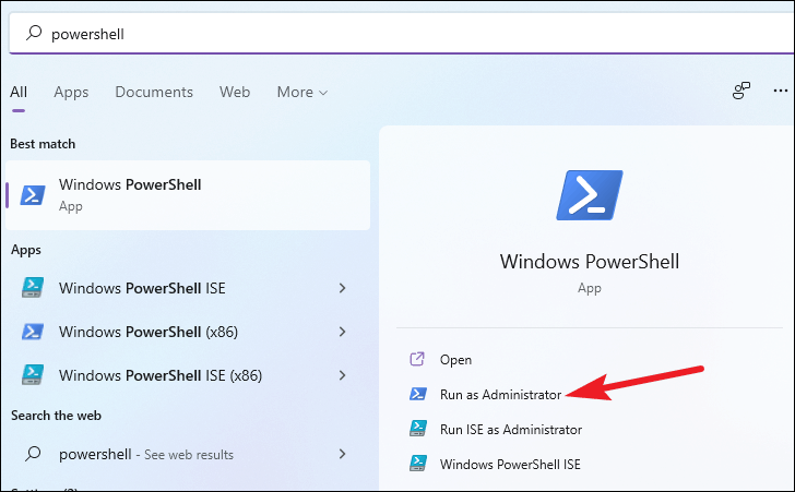 Go to the search option in Windows and search for Windows PowerShell. Then, click ‘Run as Administrator’ to run PowerShell in the administrator mode. A User Account Control prompt will appear. Click ‘Yes’ to continue.