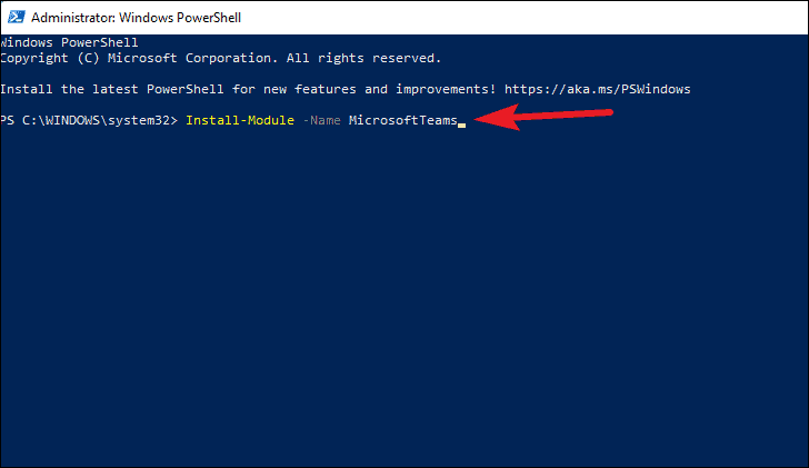 Once you run PowerShell, if you’ve never used it to run Teams commands before, you need to run the following command. This command installs the Microsoft Teams PowerShell modules which you need to run Teams-specific commands. Type or copy/ paste the following command as it is and press Enter.