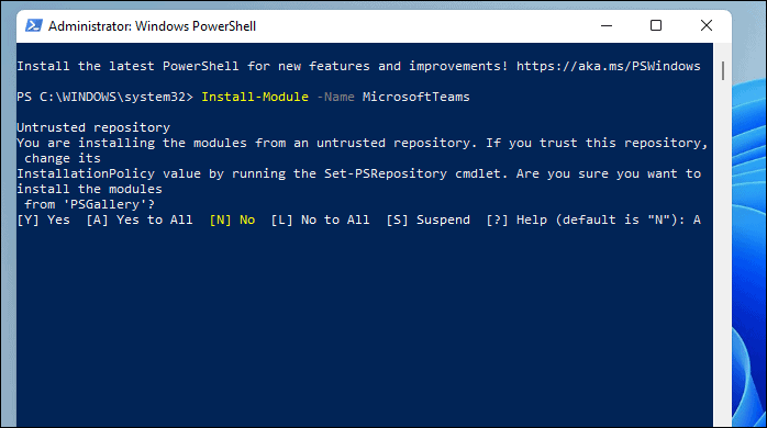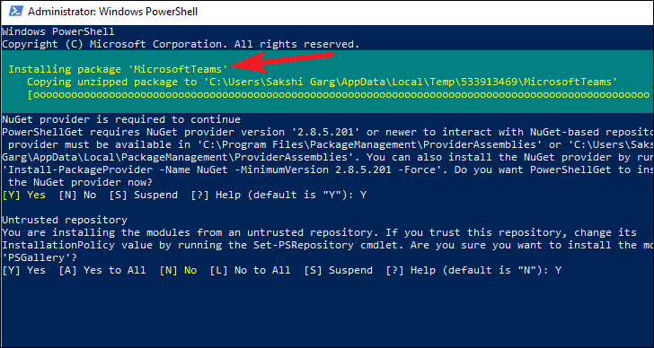 Before the Microsoft Teams module is installed, you may have to permit to install certain providers or repositories. Read the message and type ‘A’/ ‘Y’ (depending on the message on the screen) to continue installing the module.