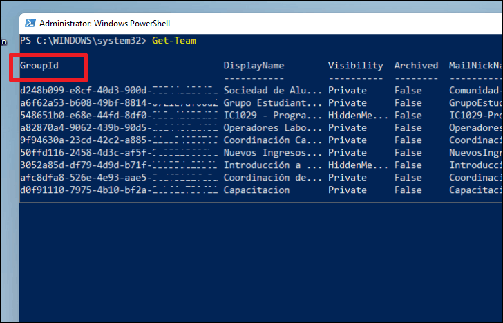 PowerShell will display the list of all your teams with GroupId and some other details. You’ll need the GroupId for the team you want to add the members to. Copy the GroupId corresponding to the Team’s name you want.