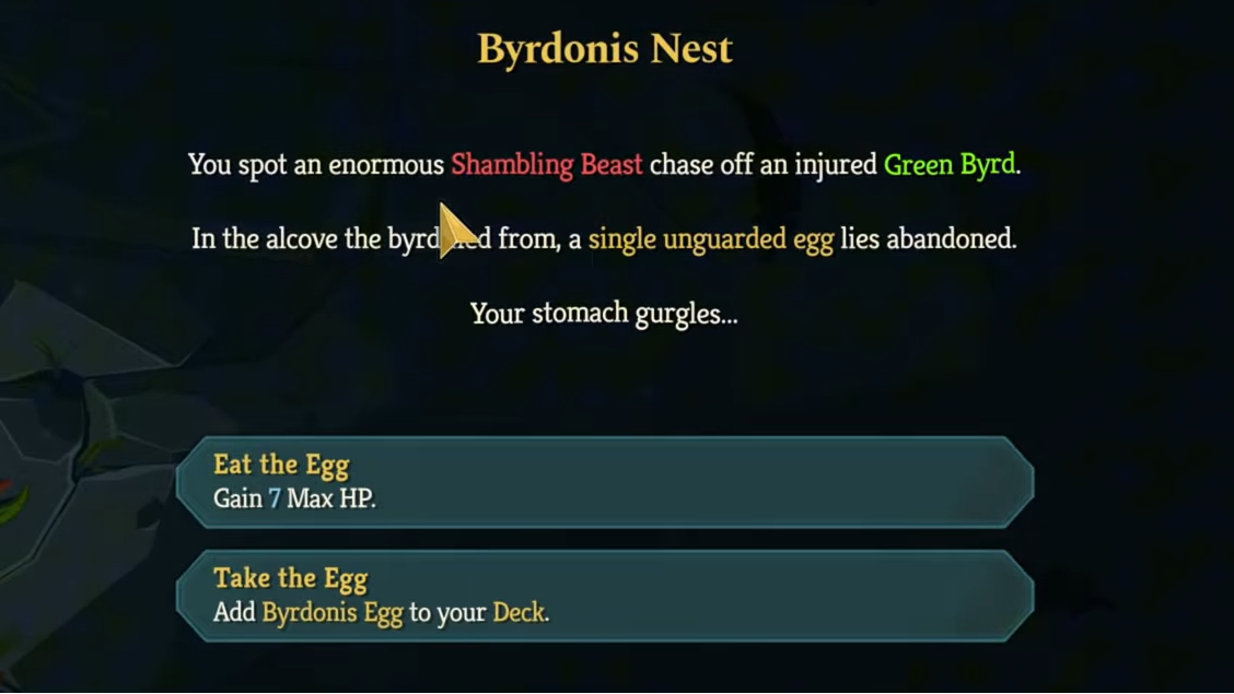That event gives you two choices. One raises your Max HP by 7. The other adds Byrdonis Egg to your deck. If you want to hatch the egg, you must choose Take the Egg.