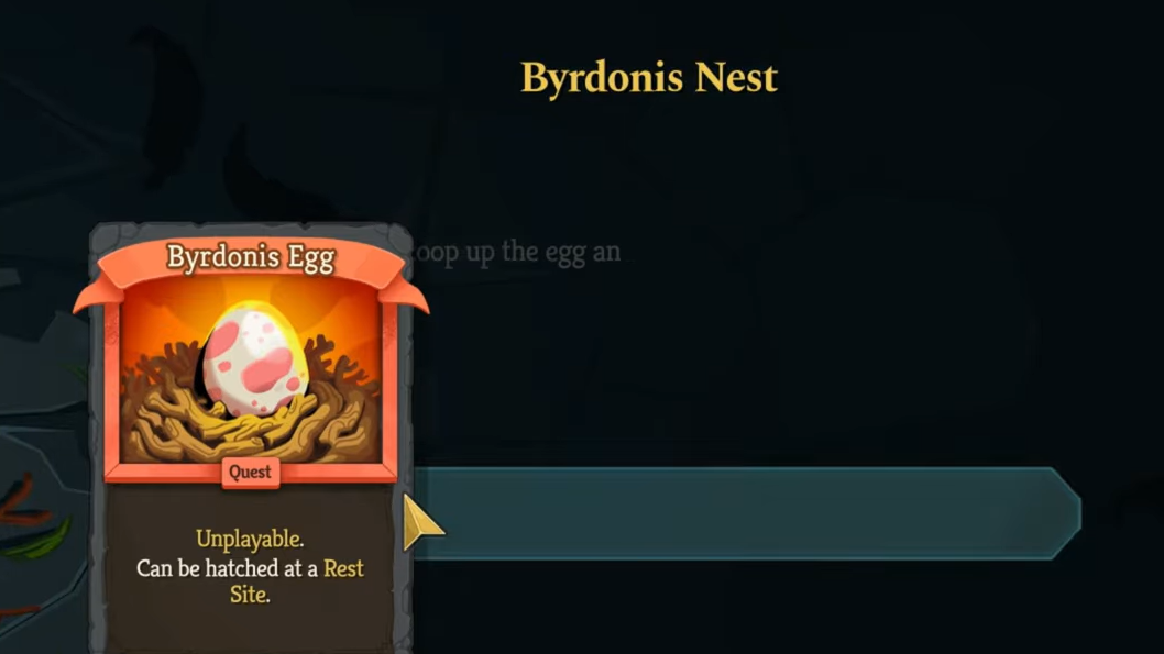 Byrdonis Egg is a Quest card in Slay the Spire 2. It starts as an unplayable card in your deck, and it only changes once you bring it to a Rest Site and choose Hatch.