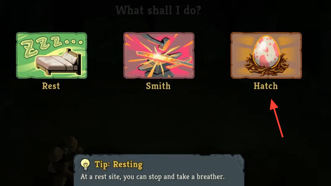 The whole sequence is short once you know the trigger. Take Byrdonis Egg from Byrdonis Nest, reach a Rest Site, choose Hatch, and confirm the result by checking that Byrdonis Egg has turned into Byrd Swoop.