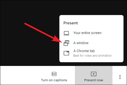 A menu will appear. You can either share your entire screen, an application window, or just a Chrome tab. Click on the one you want to share.