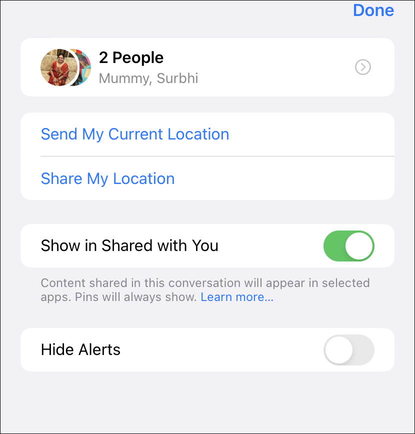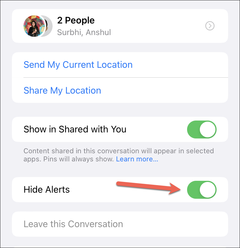 You can also hide the alerts from the group chat detail page. Tap the group name/ icon at the top to open the detail page. Then, turn on the toggle for âHide Alertsâ.
