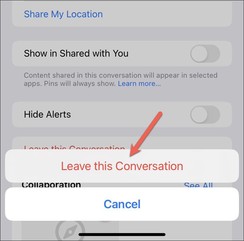 A confirmation prompt will appear. Tap âLeave this Conversationâ from the prompt to make your exit from the group.