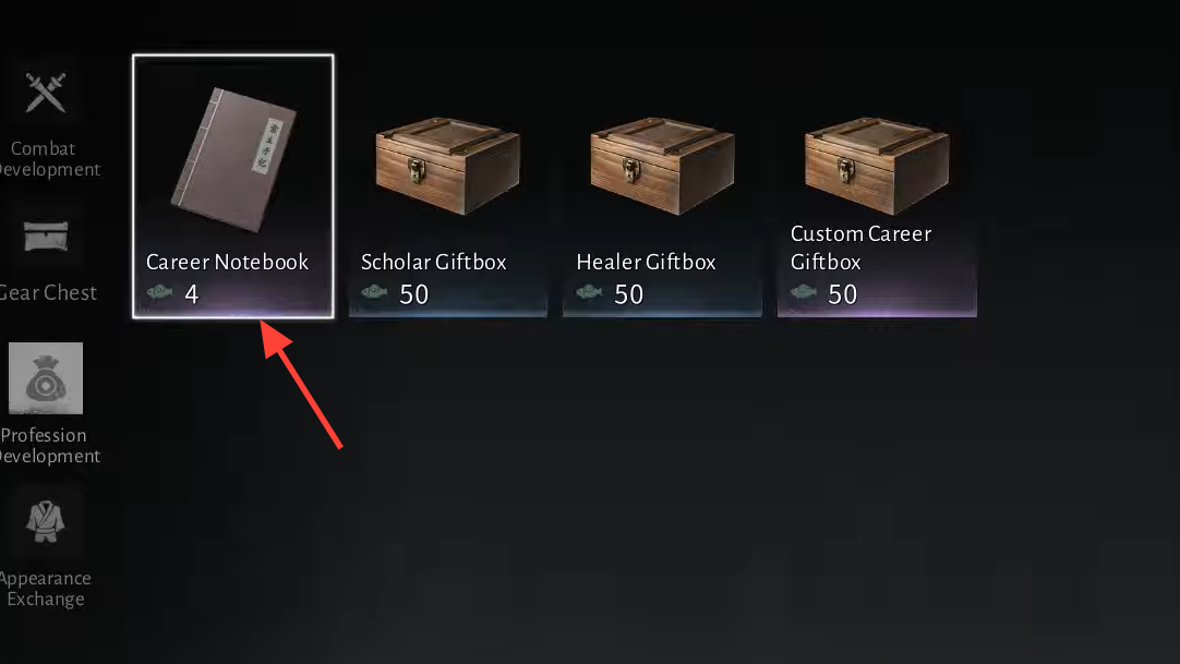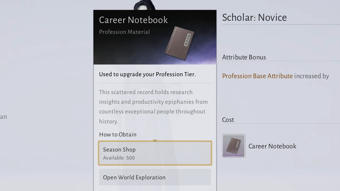The Season Shop sells Career Notebooks in limited quantities for Jade Fish currency. Stock refreshes weekly, so check the merchant after each reset to purchase available notebooks. This weekly rotation creates a bottleneck for profession advancement, especially if you are leveling both Healer and Scholar simultaneously.