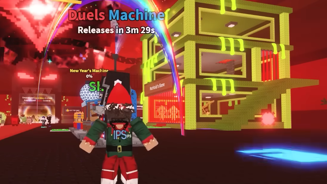 In the duel arena, you can use your weapons, abilities, and items. Many high‑tier players bring strong tools such as body swap abilities, turrets, Santa sleigh, air strikes, and homing projectiles, which can make fights feel pay‑to‑win if one side is much better equipped.