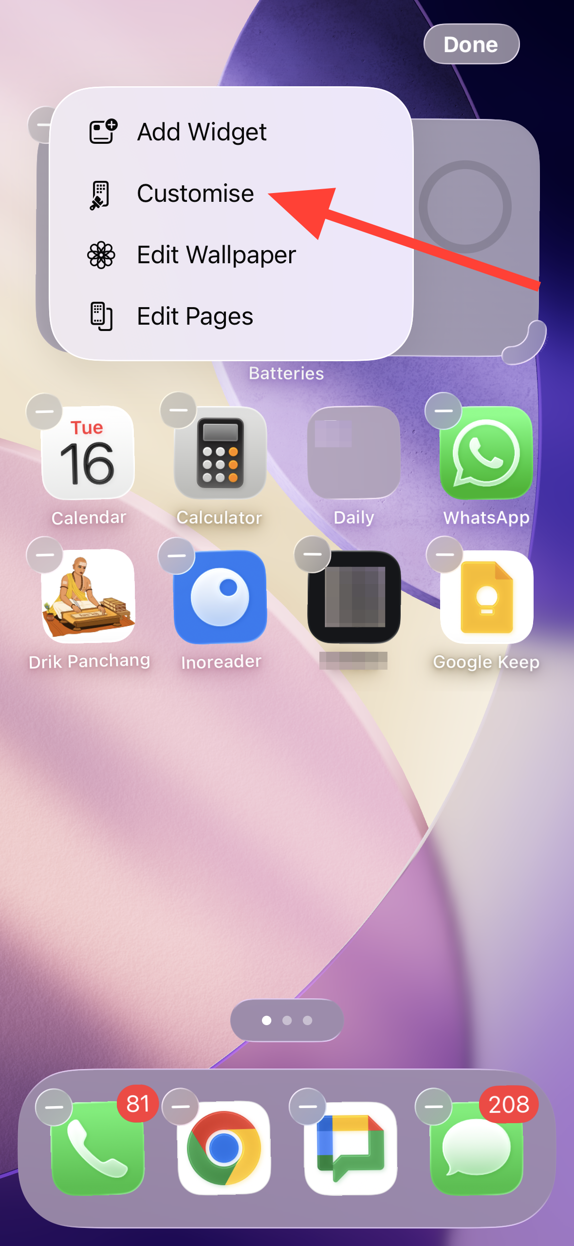 Step 1: Enter edit mode again. Touch and hold the Home Screen background until icons jiggle, then tap Edit followed by Customize to open the appearance panel.