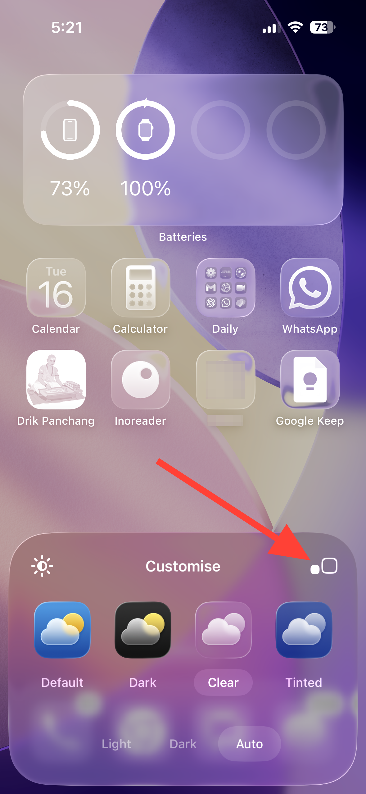 Step 2: Select the default look. Choose Light or Dark without Clear or Tinted, or use Auto for dynamic switching. Tap outside the panel to apply.