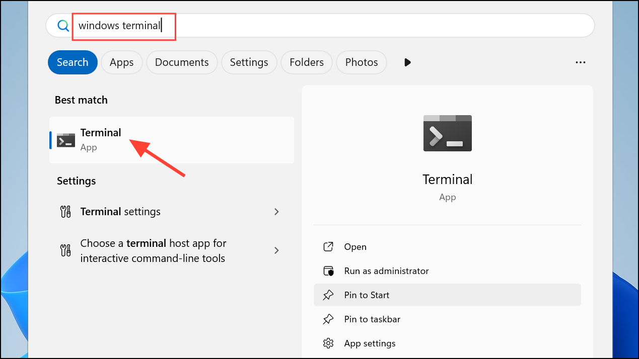 Step 1: Open the Start Menu, search for Windows Terminal, and launch the application. If Command Prompt is not the default profile, open a new Command Prompt tab by clicking the down-arrow icon in the title bar and selecting "Command Prompt."