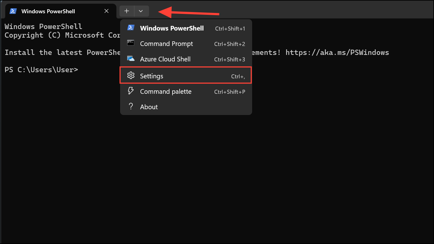 Step 2: Access the settings menu by clicking the same down-arrow icon and choosing "Settings" from the dropdown list. Alternatively, you can use the keyboard shortcut Ctrl + , (comma).
