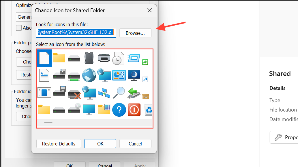 Step 3: Browse through the available icons or select Browse to locate a .ico file you’ve downloaded or created. Select your preferred icon and click OK.