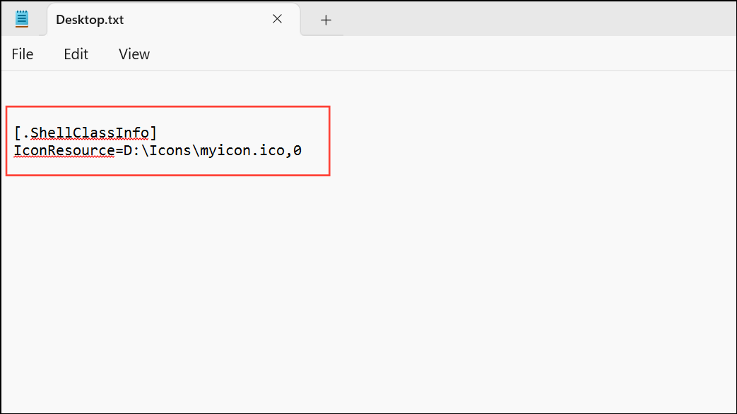 Step 3: In the target folder, create a text file named desktop.txt and open it. Add the following lines, replacing the path with your actual icon location:
