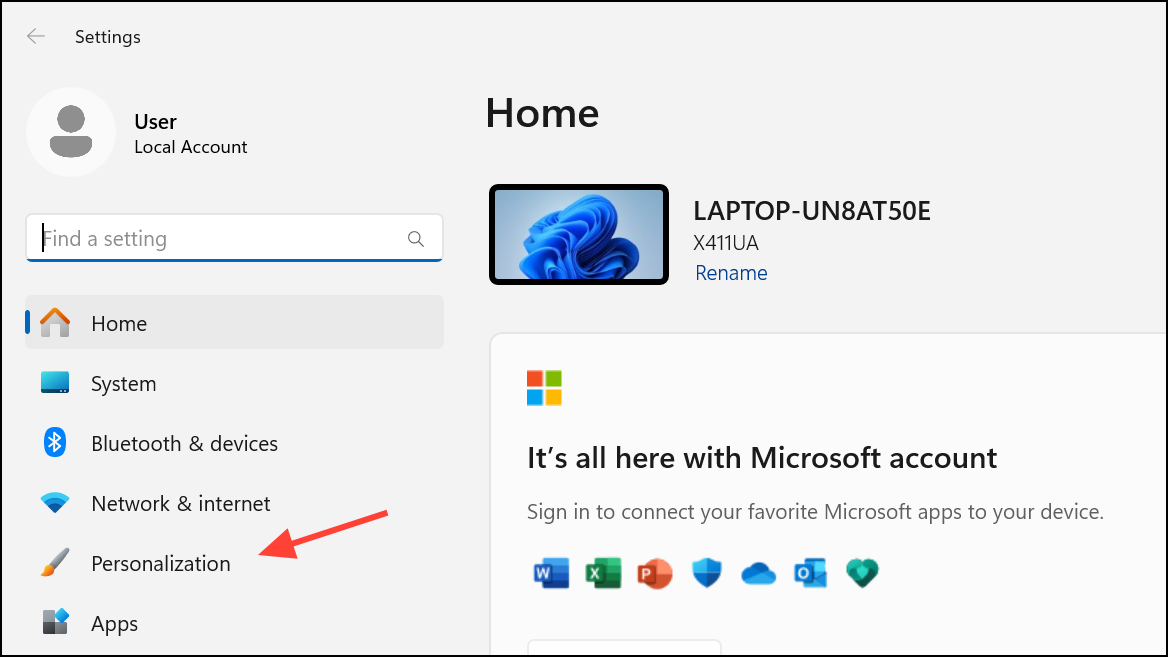 Step 2: In the Settings window, select Personalization from the left sidebar. This section manages appearance-related options, including background, colors, and themes.