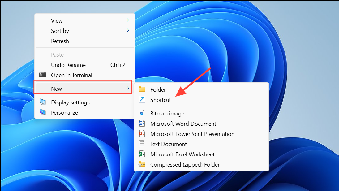 Step 1: Right-click an empty area on your desktop and choose New > Shortcut. This launches the shortcut creation wizard.