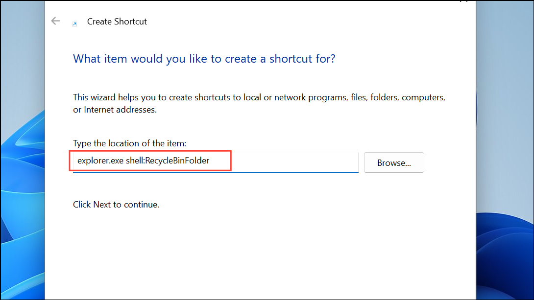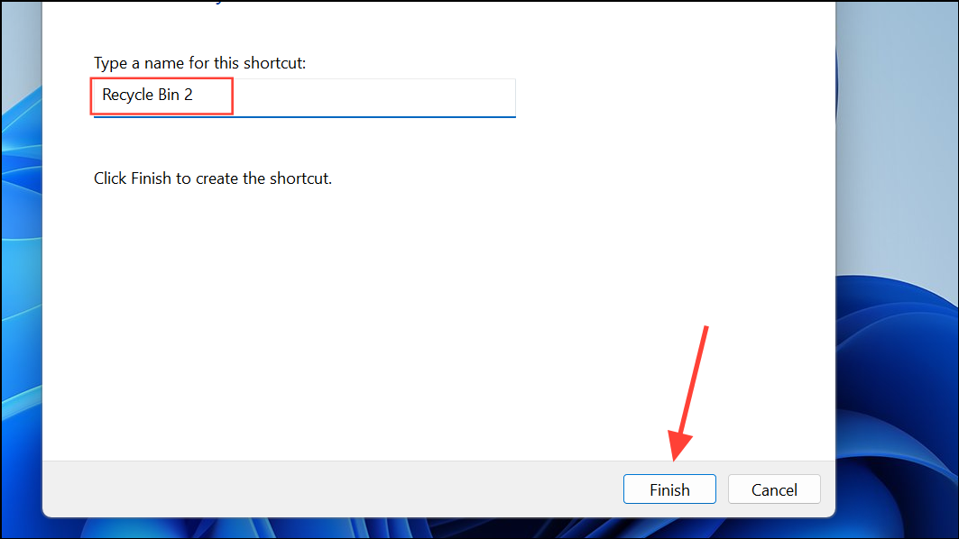 Step 3: Click Next, then name your shortcut (for example, “Recycle Bin”). Click Finish to place the shortcut on your desktop.