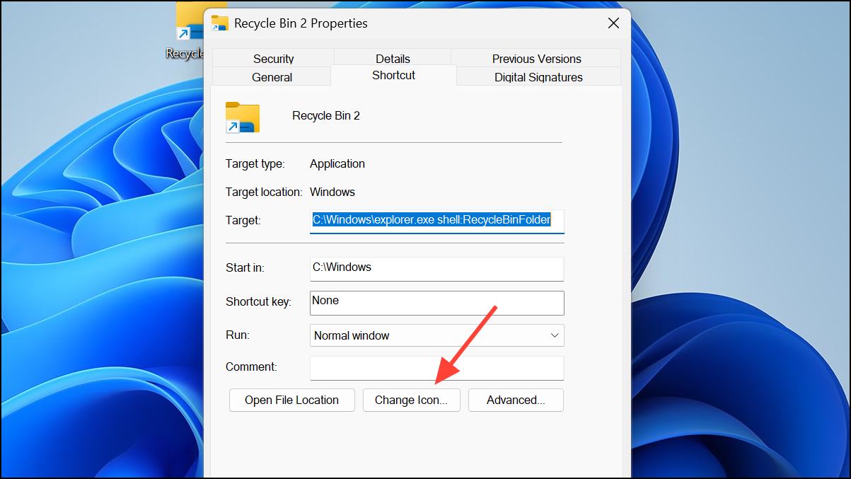 Step 6: Click Apply and OK in the Properties window. Your custom shortcut now displays the chosen icon and opens the Recycle Bin when double-clicked.