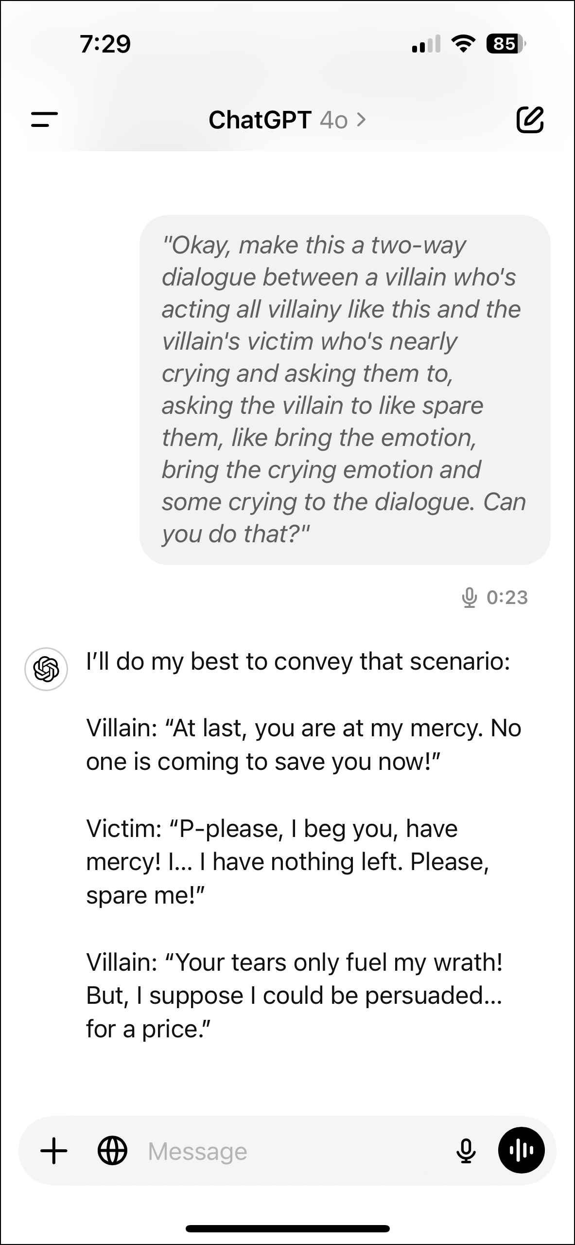 While asking it to narrate a sad story while simulating some crying, it downright refused. But when I prompted it to roleplay a conversation between a villain and a victim, it did simulate crying then. This showed me that even when ChatGPT is capable of doing something, it's simply making me jump through some hoops and I did not care for it.