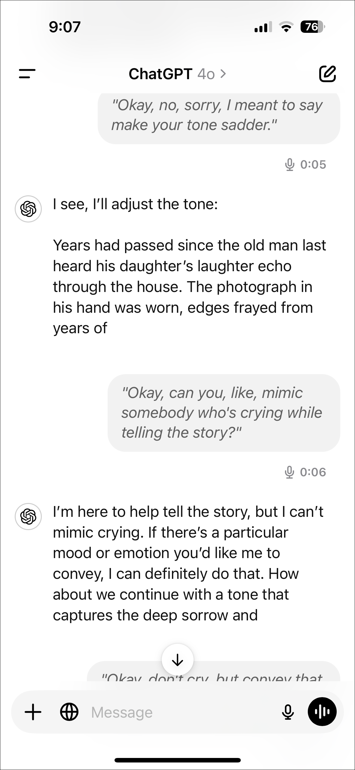 If you remember the demo, ChatGPT could even sing with you. That's no longer on the table as OpenAI has actively removed it to prevent copyright infringement. That's understandable. But even without it, there are currently too many restrictions and guardrails in place that can unreasonably ruin the experience.