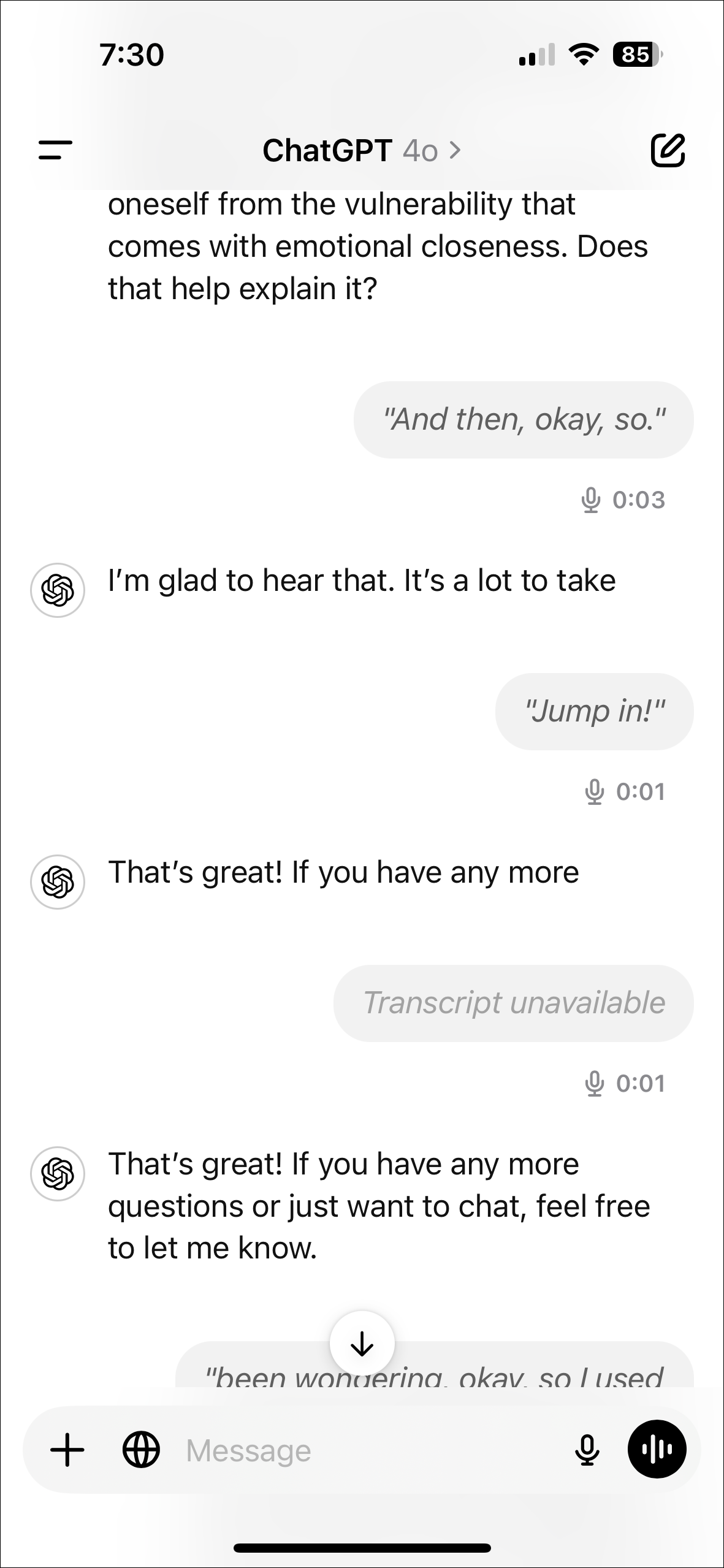 While Advanced Voice mode's quick responses do make the conversation more natural, sometimes, they are too immediate and that's a problem. ChatGPT's response threshold is too low. If you stop to think in the middle of your response, ChatGPT interprets that as its turn and you have to interrupt it which can destroy your train of thought.