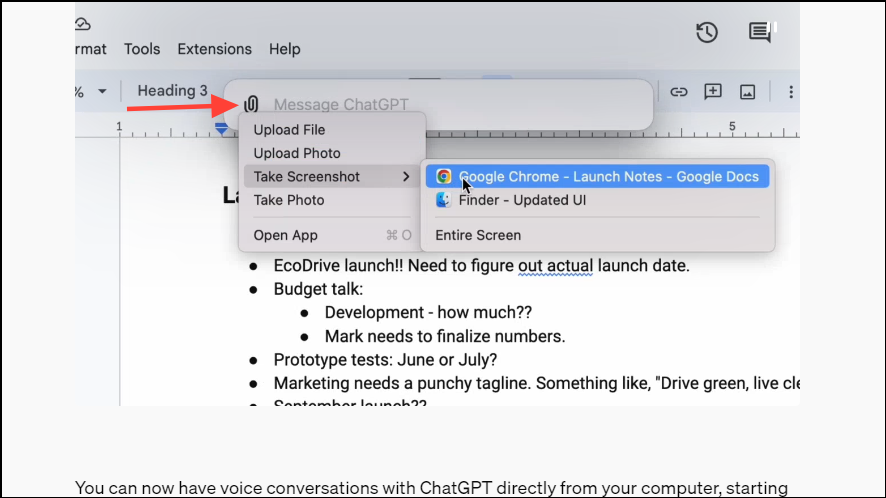 By clicking the paperclip icon, you can upload files, and photos, or take screenshots of whatever you are working on and discuss those in the app. This is possible thanks to the vision capabilities of the app, which lets it see what is going on on your screen.