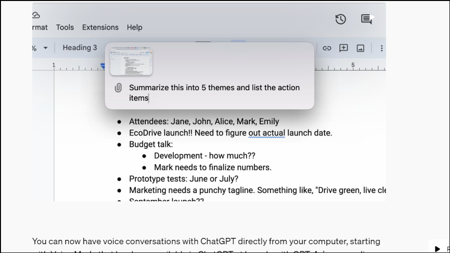 OpenAI also demoed GPT-4o's new audio and video capabilities at the launch event. With these features, you'll be able to talk to ChatGPT or give it access to the contents of your screen. For example, highlighting sections of text, such as that of a code you are working on, will allow you to discuss it with ChatGPT right from the desktop app.