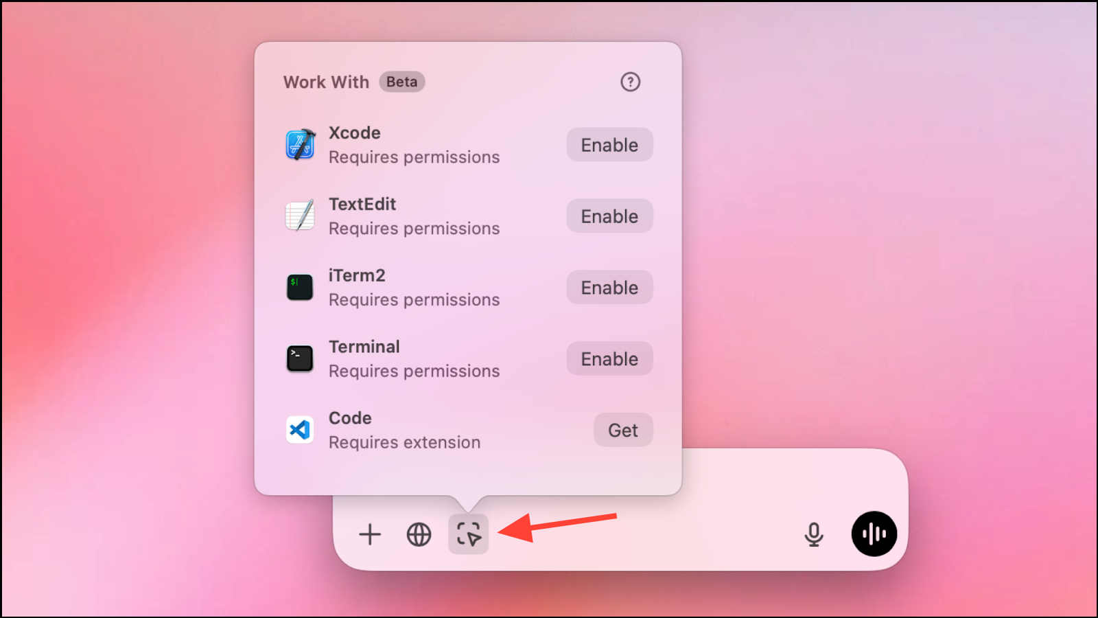Once an app is running, you can click the 'Work with Apps' button from the ChatGPT Prompt bar and select the app. Apps can also be selected using the Option + Shift + 1 keyboard shortcut; the topmost app on your desktop will be selected.