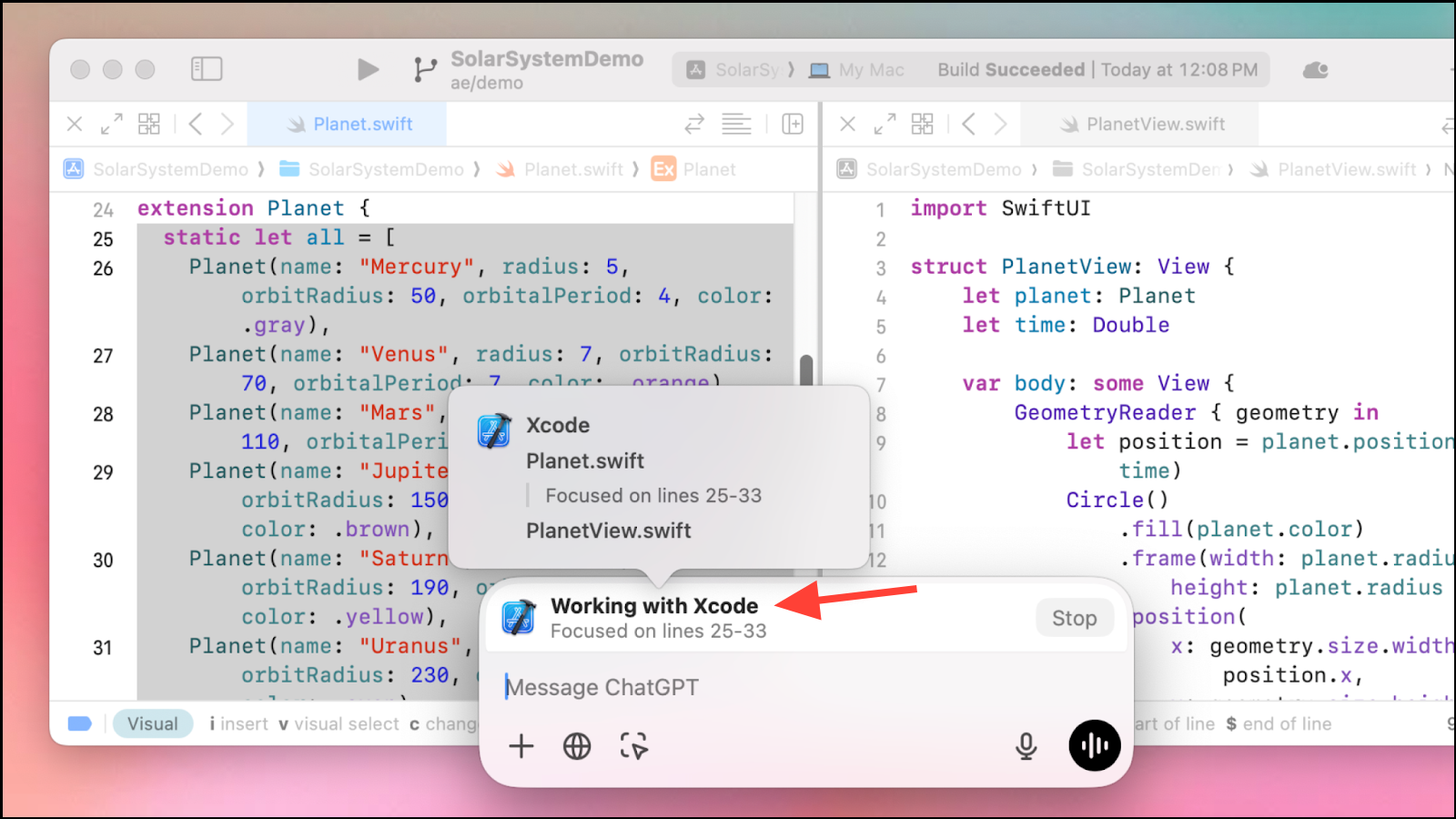 Since ChatGPT can now automatically view the content of your screen, this means you don't have to copy-paste the code or text to send it to ChatGPT. For text editors and code editors, the full context of the foremost window (up to a truncation limit) is sent to ChatGPT. However, for terminals, only the last 200 lines of the open pane are sent.