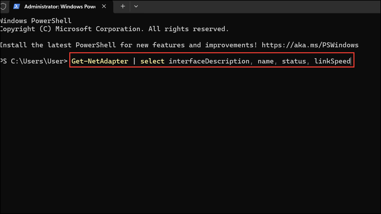 This command lists all network adapters on your system, showing their description, name, current status, and linkSpeed. This approach is effective for quickly reviewing all adapters, especially if you have multiple network interfaces or want to script checks across several machines.