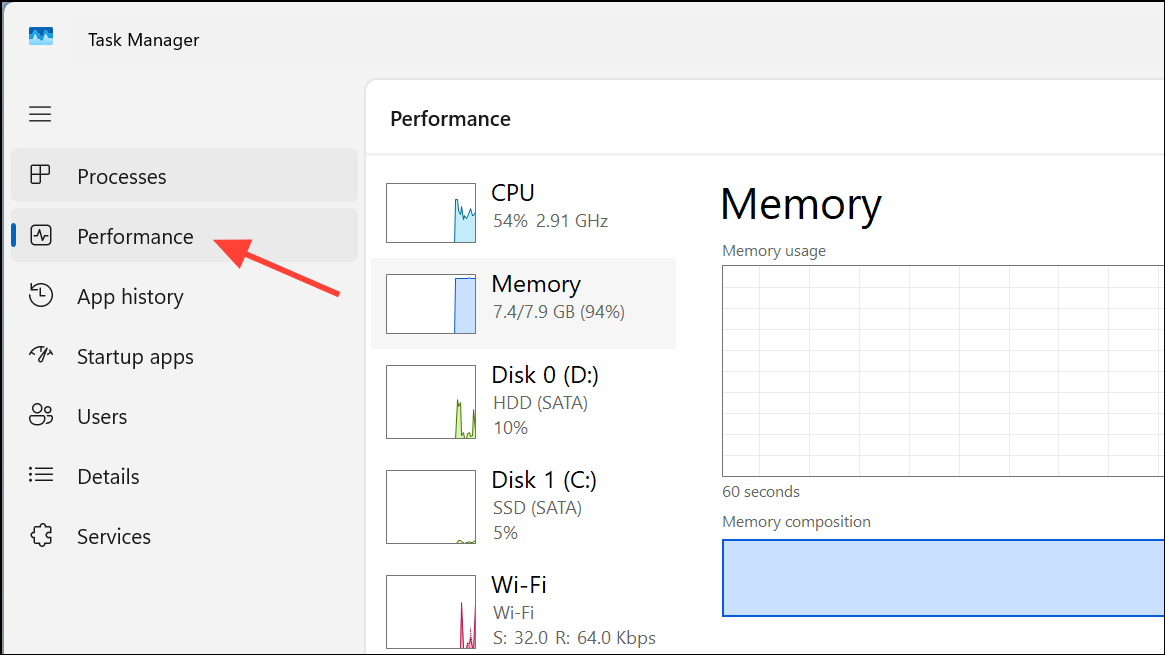 Step 3: Select Memory from the list. The main panel displays comprehensive memory information, including total capacity, current usage, and—crucially—your RAM speed, typically shown in MHz or MT/s near the bottom center of the window. You will also see details such as form factor (DIMM/SODIMM) and the number of RAM slots in use.