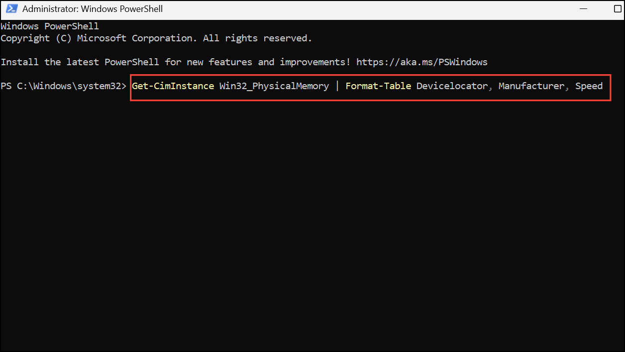 Get-CimInstance Win32_PhysicalMemory | Format-Table Devicelocator, Manufacturer, Speed