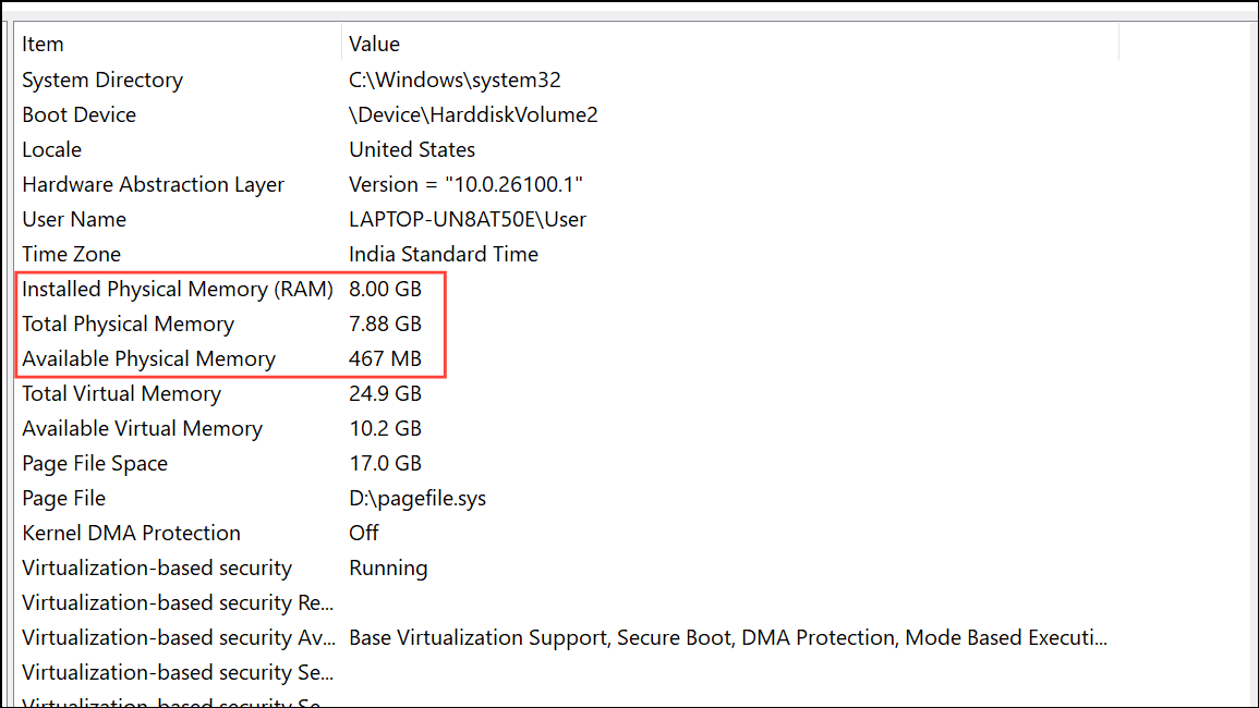 Step 2: In the System Summary, look for entries labeled Installed Physical Memory (RAM), Total Physical Memory, and Available Physical Memory. While this tool does not always display speed, it’s useful for confirming total capacity and available memory at a glance.
