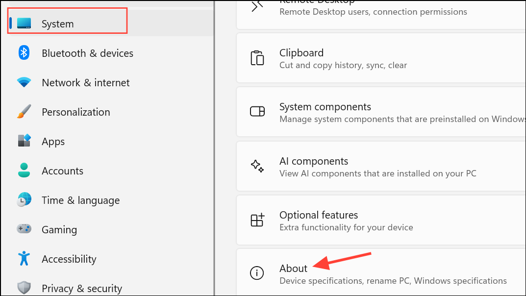 Step 2: In the Settings window, click on System in the left sidebar. Then scroll down and select About.