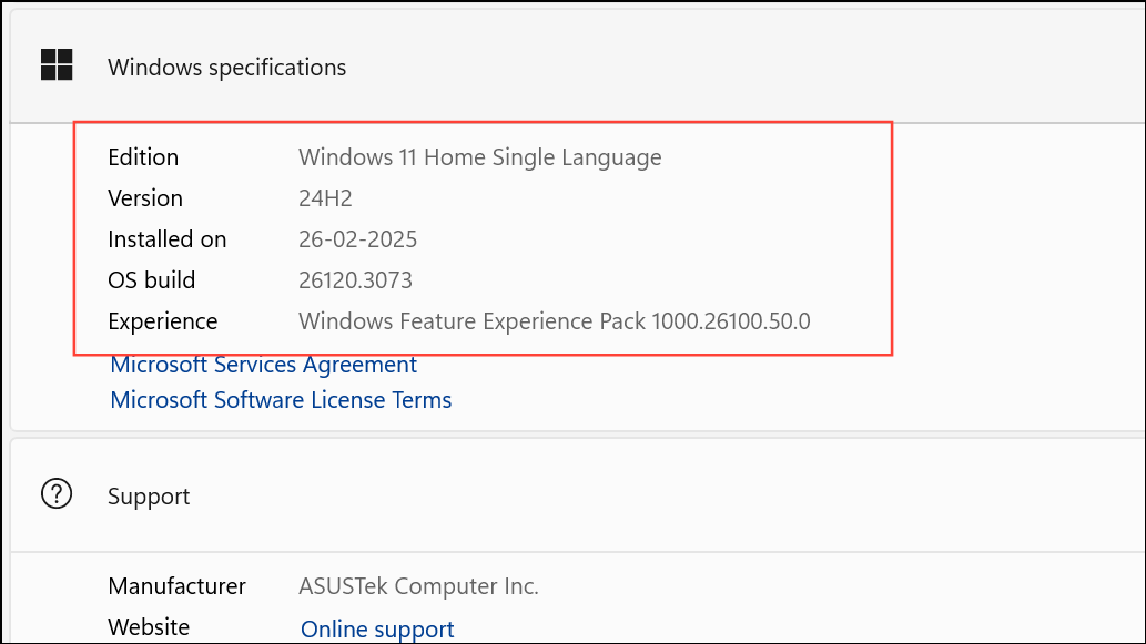 Step 3: In the About section, look for the Windows specifications area. Here you’ll find detailed information including your edition, version, OS build, and the Windows Feature Experience Pack installed. This section also confirms if you’re running a 32-bit or 64-bit version and provides the device name for reference.