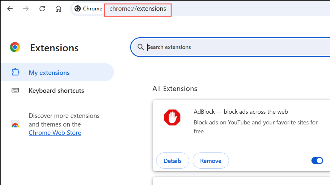 Step 1: Open your browser’s extensions or add-ons manager (e.g., chrome://extensions for Chrome, about:addons for Firefox).