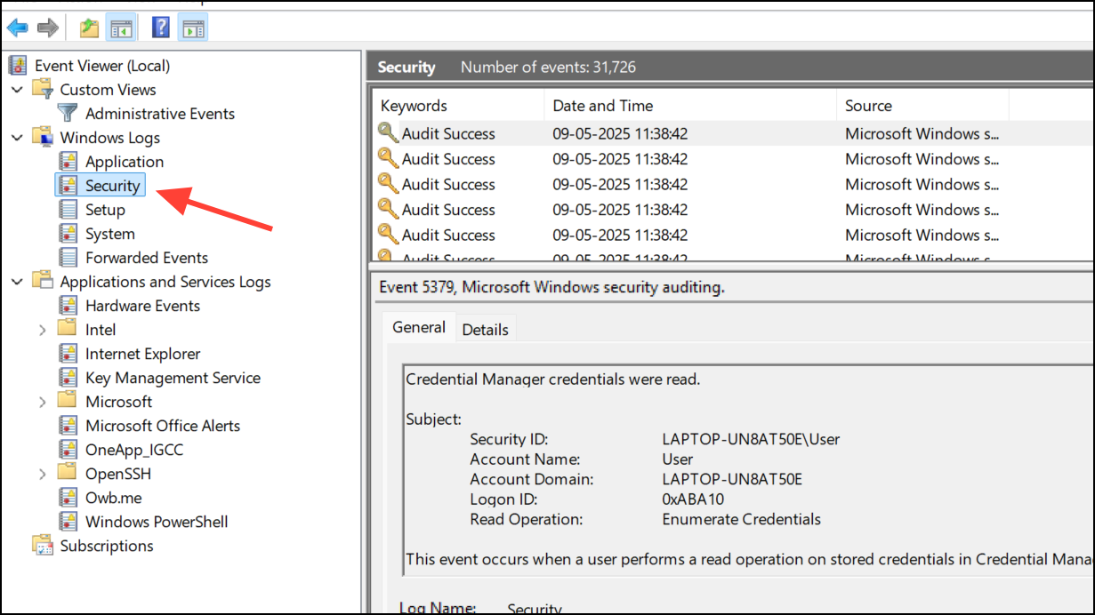 Step 1: On Windows, open Event Viewer via Windows Administrative Tools and navigate to Windows Logs > Security. Look for logon/logoff events outside your normal usage times or from unfamiliar accounts.