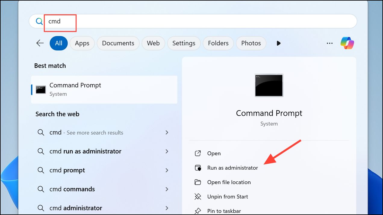 Step 1: Open the Start menu, type cmd, then right-click Command Prompt and choose Run as administrator.